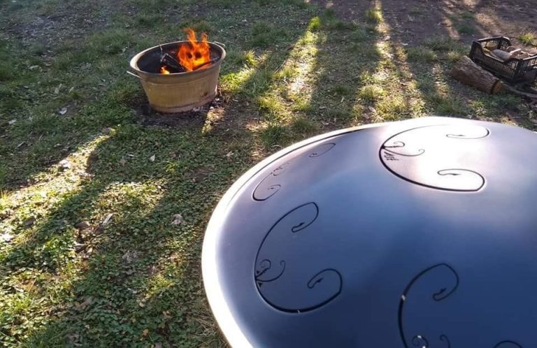 Regelmäßige Präsenztreffen am Feuer in Gruppenarbeit mit Klangtherapeutin (Handpan, Gitarre und Klangschalen).